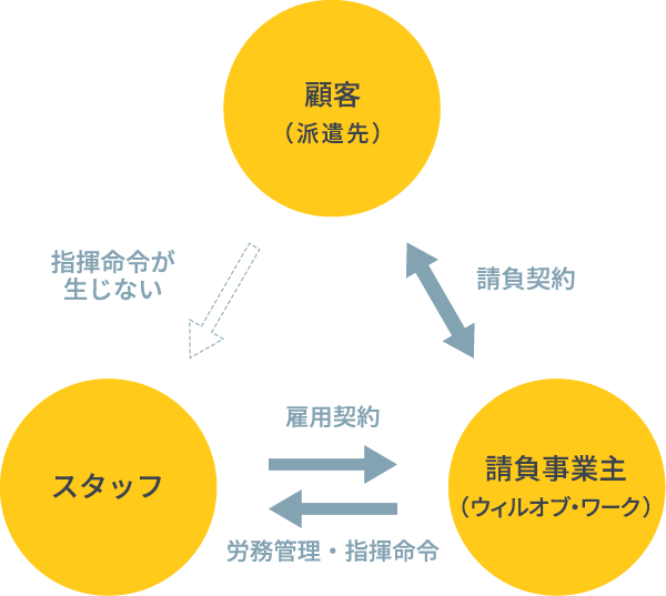あなたを雇用し、お給与を支払うのは請負会社(ウィルオブ・ワーク)ですが、お仕事の指示や管理を行うのも請負会社となります。当社の現場責任者が常駐していますので、その指示に従ってお仕事をしていただきます。
